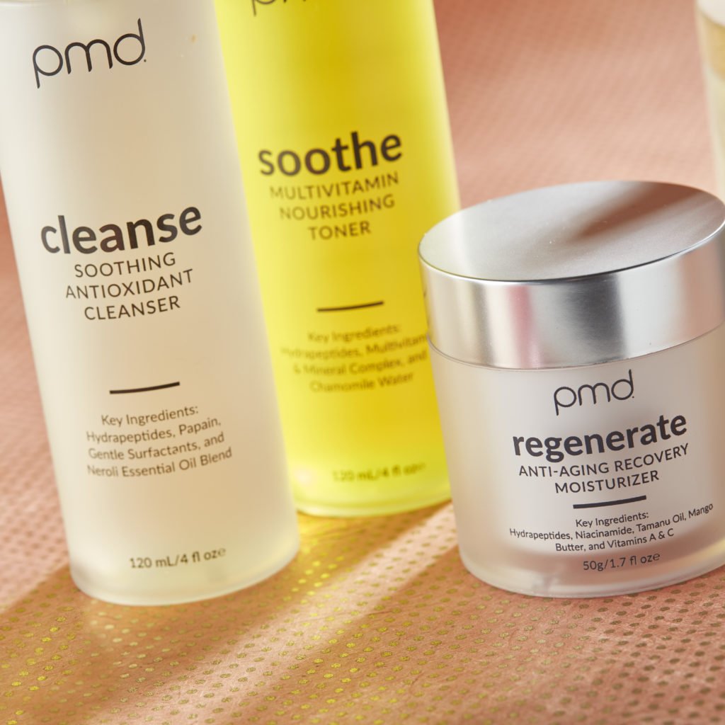 Hydrated skin is happy skin. When your skin is moisturized and nourished, not only will it look more plump in the moment, but your skin is being taken care of on a cellular level. That’s why the Daily Cell Regeneration System was specially formulated with hydrapeptides™ that are a fusion of hyaluronic acid and peptides. Hyaluronic acid is one of the most coveted ingredients in all skincare because it is so deeply hydrating. PMD combined hyaluronic acid with peptides which are a binding structure on the cellular level. This means with each use of the Daily Cell Regeneration System you’re strengthening and hydrating each cell of your skin. We suggest cleansing, toning, and moisturizing at least once daily to properly care for your skin.